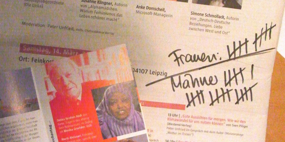 In diesem Blog habe ich über Ähnliches ja auch schon häufiger nachgedacht. Im März 2009 war mir zum Beispiel ein Trend aufgefallen, den ich „Cover-Girls“ genannt habe – damit meine ich, dass viele Veranstalter ihr Defizit in Punkto weibliche Beteiligung damit überdecken, dass sie die wenigen Frauen, die eingeladen sind, immerhin prominent auf ihre Flyer und Programmhefte drucken.