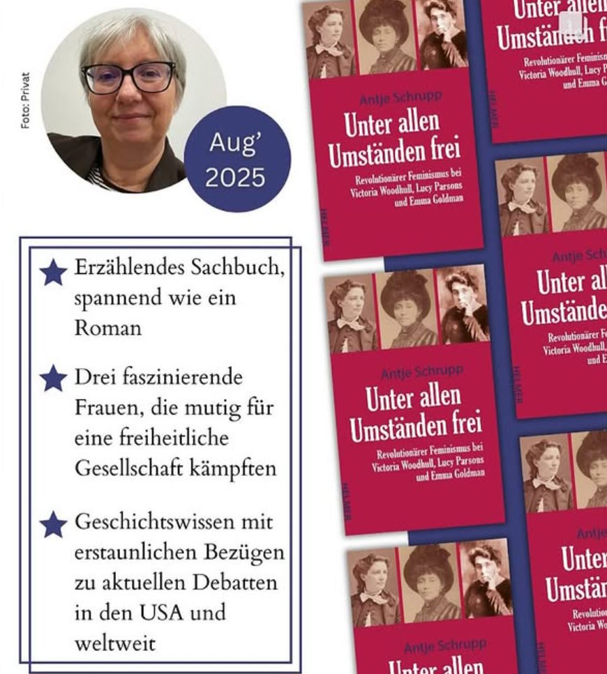 „Unter allen Umständen frei. Revolutionärer Feminismus bei Victoria Woodhull, Lucy Parsons und Emma Goldman“ erscheint im August 2025 im Ulrike Helmer Verlag. Hier der Link zur Verlagsvorschau!